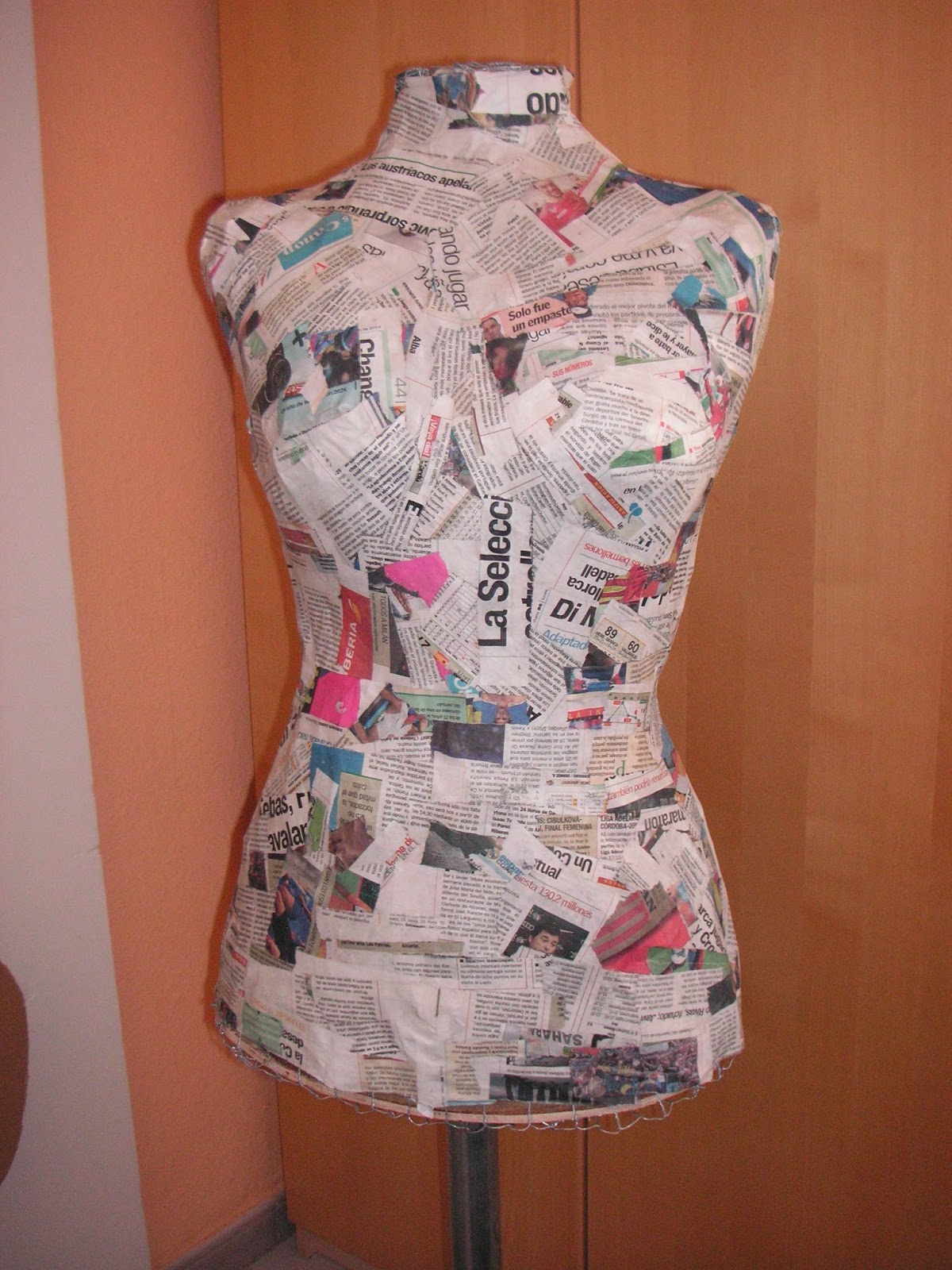 Hay muchísimas páginas donde he visto maniquíes preciosos. Y después de ver muchos decidí hacer uno. Empezó siendo una estructura de malla de alambre, la rellené de papel de periódicos arrugados. Le puse una base que era el fondo de madera de una vieja silla de oficina (recogida en la calle). Mi chico me consiguió una base de metal con unas ruedas pequeñitas que apenas se veían a la que le adaptamos una varilla roscada que tapamos con un tubo metálico. El resto fue la parte más creativa: cubrir toda la estructura metálica con papel maché (tiras de papel de periódico y cola). Pintarlo y barnizarlo fue el acabado final.